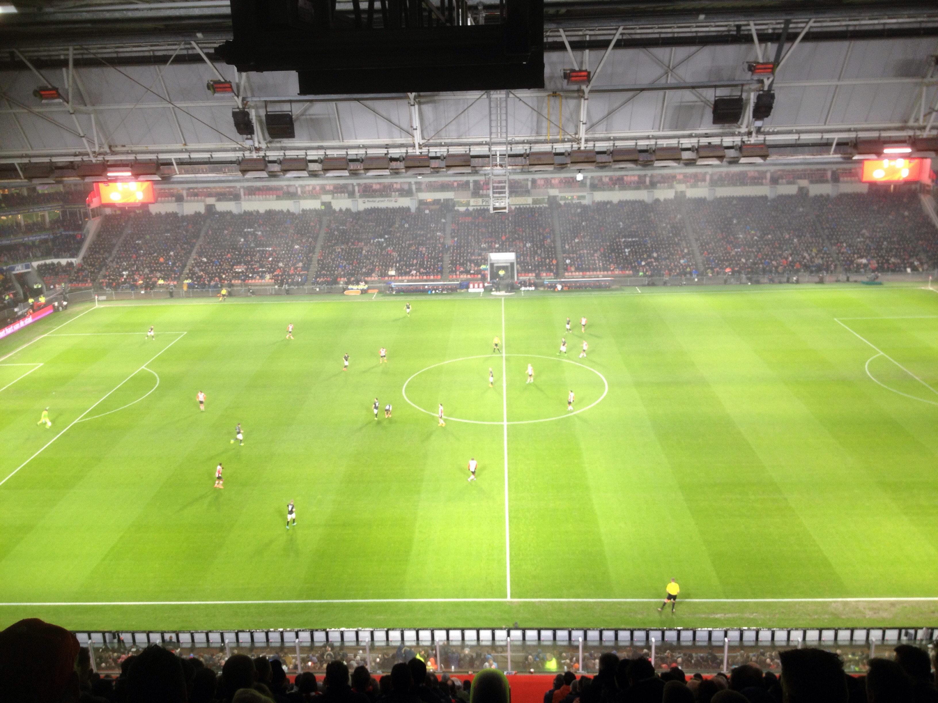 Eerst in tijdnood komen door de file, aangezien er meer mensen zijn die naar dezelfde wedstrijd willen, dan ook nog aan de verkeerde kant van het stadion staan en dan blijkt dat de plaatsen die je hebt op de allerbovenste rij zijn. Direct boven aan het uiteinde van de trap zonder andere stoeltjes voor je en ik kan u vertellen dat als je al geen hoogtevrees hebt je dit vanzelf krijgt. Stiekem stond ik doodsangsten uit!