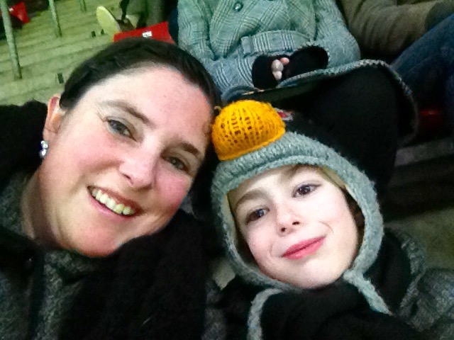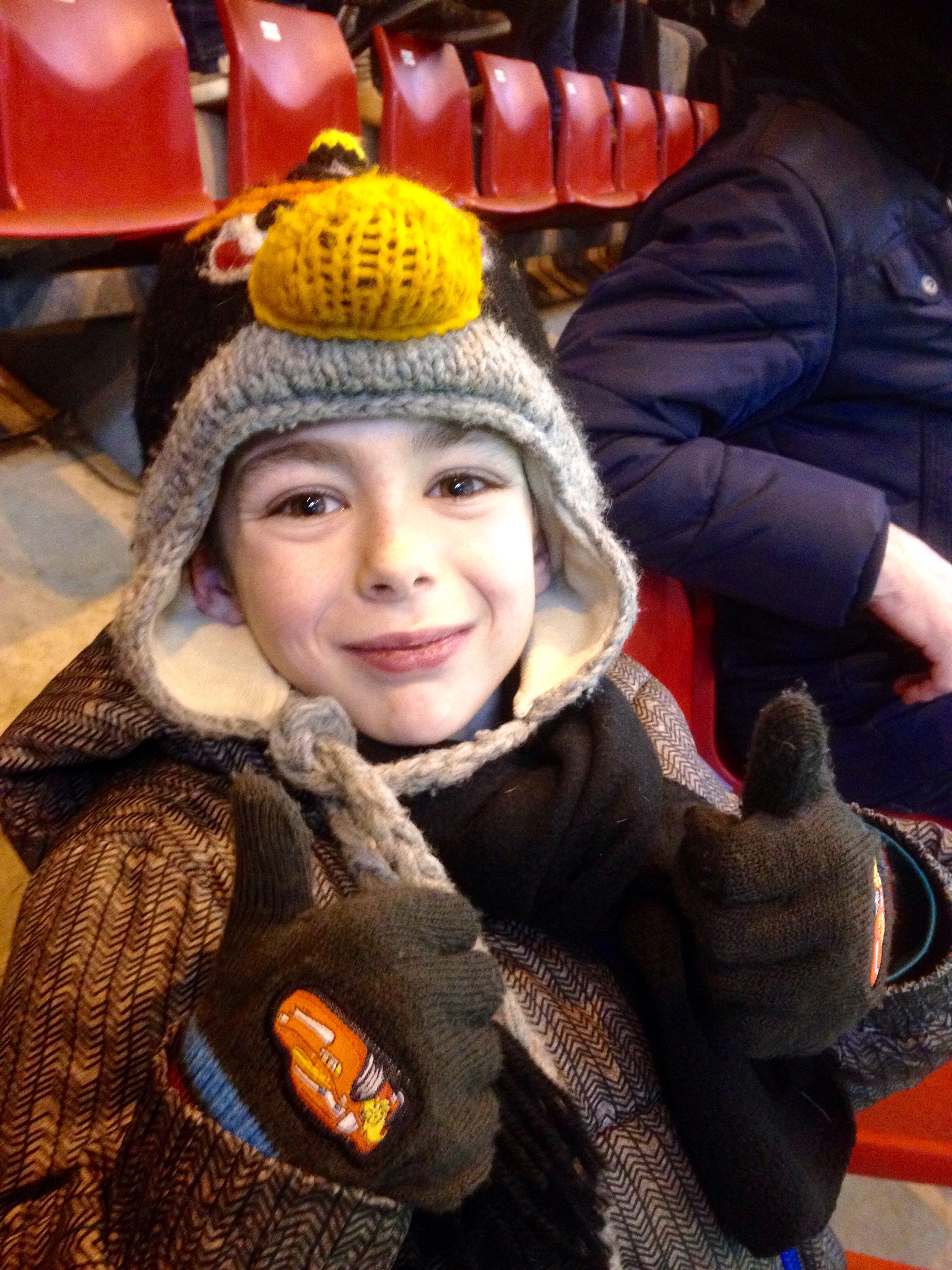 Zonder iets te zeggen of mijn ongemak te laten merken over de toegewezen plaatsen, barst Joël plotseling al snel in tranen uit en wil naar huis. Na wat doorvragen blijkt dat hij het vreselijk eng vind daar boven aan die trap en wil er absoluut niet blijven zitten. Aangezien de wedstrijd al begonnen is en ik niet verwacht dat er nog veel mensen komen besluit ik de 2 vrije plaatsen te benutten 10 rijen lager naast de trap en Joël kan hier gelukkig beter mee leven.