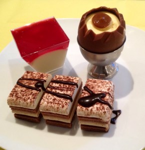 Dit jaar bestond mijn zelfgemaakte paasmenu uit 4 gangen namelijk: vissoep, vitello tonato, beenham met een champignon/pepersaus, aardappel schijfjes en gegratineerde groeten (aubergine, courgette en zoete aardappel) en als nagerecht een trio bestaande uit een paasei gevuld met vanile ijs, een puddinkje met rode vruchtensaus en een latte macchiato gebakje. Tja mijzelf wegen sla ik maar een weekje over!