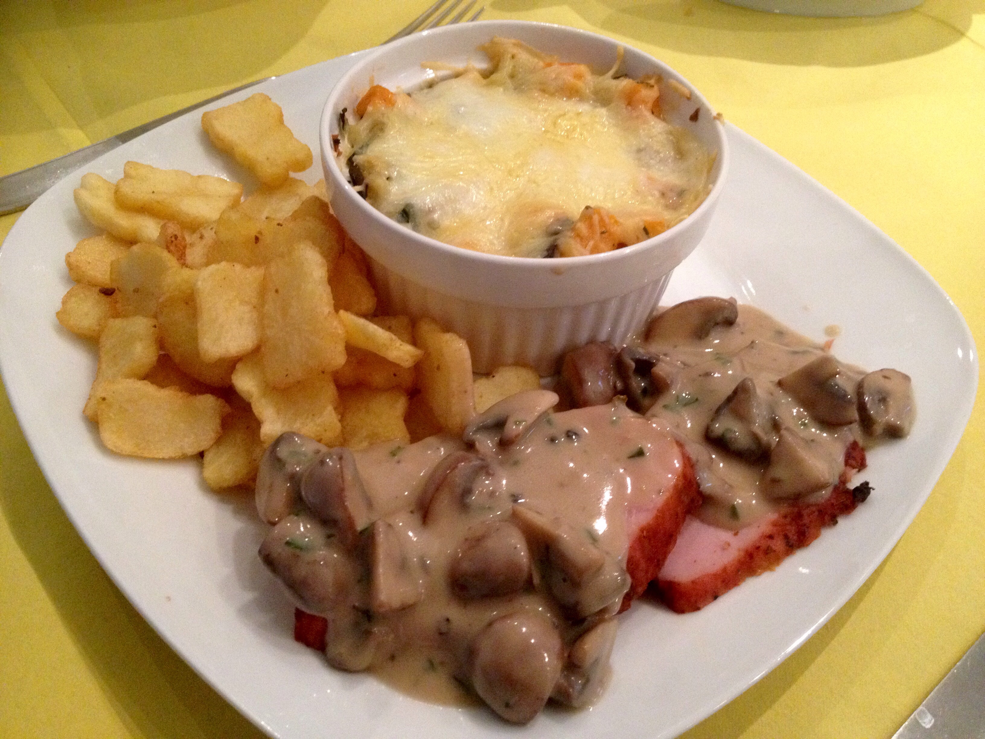 Dit jaar bestond mijn zelfgemaakte paasmenu uit 4 gangen namelijk: vissoep, vitello tonato, beenham met een champignon/pepersaus, aardappel schijfjes en gegratineerde groeten (aubergine, courgette en zoete aardappel) en als nagerecht een trio bestaande uit een paasei gevuld met vanile ijs, een puddinkje met rode vruchtensaus en een latte macchiato gebakje. Tja mijzelf wegen sla ik maar een weekje over!